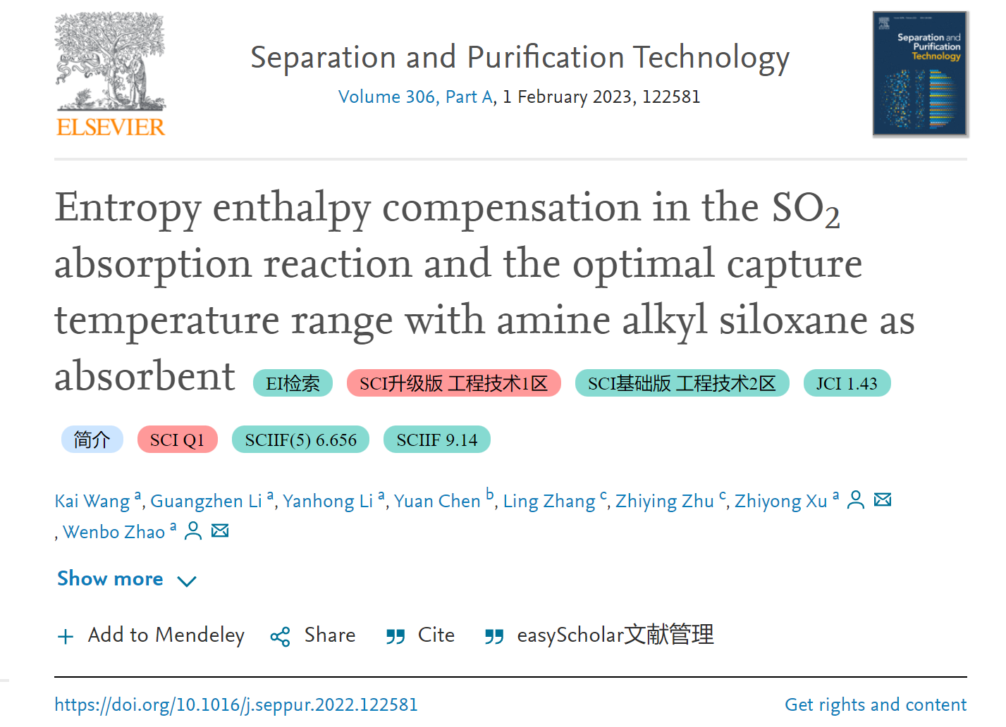 近日,赵文波教授课题组在SO2捕集方面的最新研究成果“Entropy enthalpy compensation in the SO2absorption reaction and the optimal capture temperature range with amine alkyl siloxane as absorbent”在化工领域国际Top学术期刊Separation and Purification Technology上发表。论文的第一作者为捕鱼游戏赚钱2020级硕士研究生王凯,通讯作者为赵文波教授,通讯单位为捕鱼游戏赚钱平台