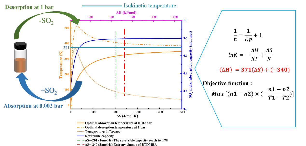 在此背景下,赵文波教授课题组根据有机硅化合物结构可调的特点,设计了一系列用于吸收SO2的胺基硅氧烷。其中含有苯基的二丁基-(1,1,1-三甲基-3,3-二苯基二硅氧基甲基)-胺(DTMBA),由于分子中苯环引入的π-π作用,其热稳定性与离子液体和低共熔溶剂相当,同时兼具较低的粘度。胺基硅氧烷的反应焓变和熵变比ILs反应焓变和熵变更负。此外,胺基硅氧烷的焓变和熵变与文献报道的吸收剂对比,发现了熵焓互补现象,获得了相关方程