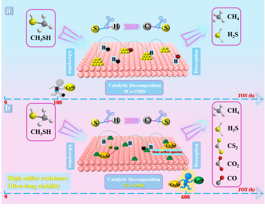 在此背景下,罗永明教授课题组合成了具有超长稳定性(>600小时)和高抗硫抗碳性能的5Cr/MCM-41催化剂并应用于甲硫醇的催化分解。通过系列表征分析发现,5Cr/MCM-41催化剂具有良好的还原性和适量的酸性,使CH3SH中的大部分C、S元素转化为气相含碳和含硫产物,而非累积在催化剂表面,从而提高了催化剂的抗硫抗碳性。同时,通过原位红外和DFT计算对稀土金属(Ce)和过渡金属(Cr)改性MCM-41催化剂的催化性能、反应路径和失活机理进行了分析。此外,重点提出并验证了在5Cr/MCM-41生成了一种新的活性相(Cr2S3),该活性相与六价铬(Cr(VI))在协同脱除CH3SH中发挥了重要作用。这些研究结果对设计高抗硫抗碳催化剂脱除甲硫醇和其他含硫产物具有重要指导意义。