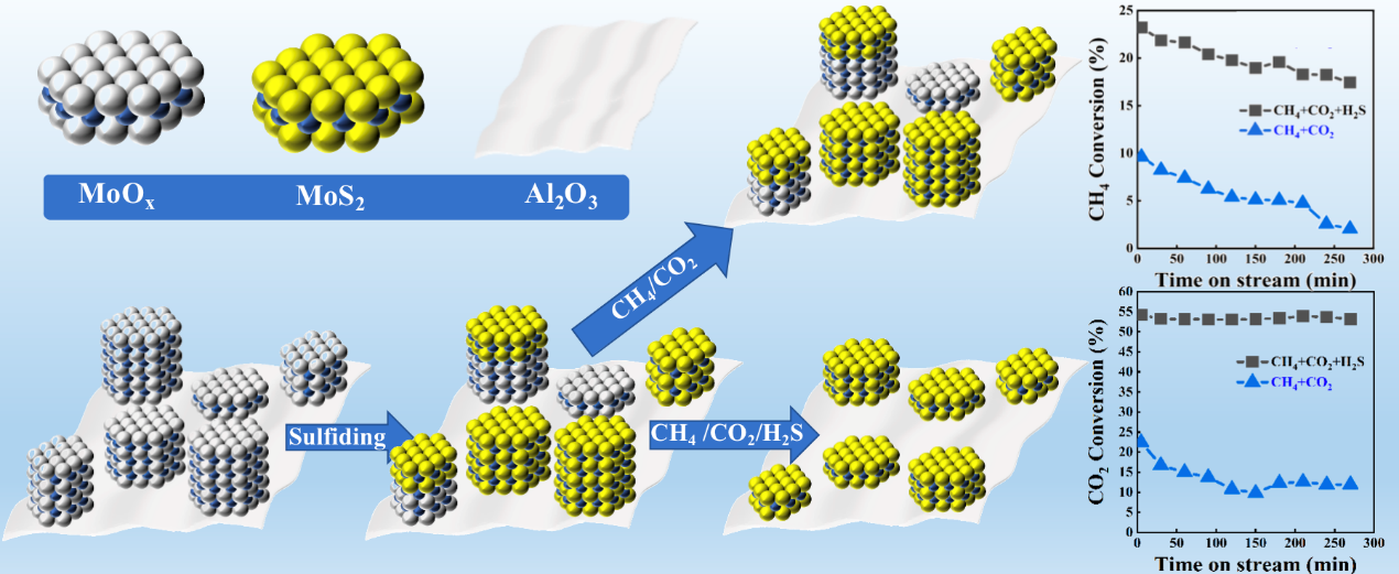 (2)随着全球天然气产量的增加,天然气中甲烷的碳中和应用(CH4/CO2重整)在可持续发展领域受到广泛关注。由于天然气中不可避免地存在硫杂质,因此甲烷干重整过程中硫中毒仍然是一个大问题。目前,钼基硫化物催化剂(MoS2)因其耐硫性强而得到了广泛地研究。然而,其中关键的问题是开发一种合适的方法来合成具有理想结晶度和合适层数的MoS2基催化剂,因为MoS2层数较少且侧面位置暴露较多可以表现出预期的催化反应活性。
