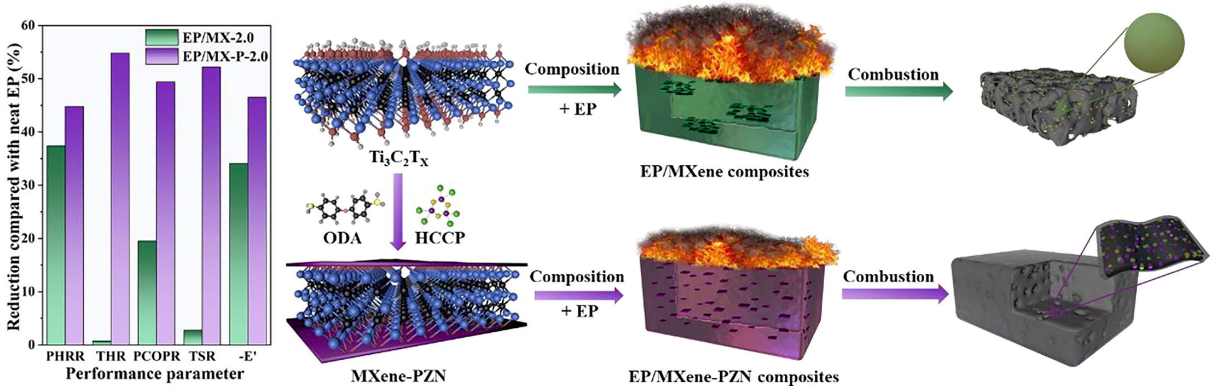 磷化工团队在MXene基协同阻燃体系的设计和机理研究中取得新进展。通过磷腈(PZN)在MXene(Ti3C2TX)表面的原位聚合反应,成功制备了磷氮改性的MXene基高效协同阻燃体系(MXene-PZN);并以MXene-PZN为阻燃功能填料,实现了对环氧树脂(EP)基材热稳定性、机械性能、阻燃性能的全面提升。结合热重、热重-红外联用、SEM、XPS等分析测试方法,重点研究了EP/MXene-PZN复合材料在燃烧的不同阶段所进行的反应和相关的产物结构分析,明确了MXene-PZN在聚合物基材燃烧过程中发挥的协效阻燃机制,包括PZN对Ti3C2TX片层结构的保护机制、Ti3C2TX与PZN的协同催化成炭机制等。该研究进一步明确了磷系改性MXene体系的协同阻燃机制,从而能够为MXene基高效阻燃体系的设计,尤其是磷氮改性MXene基阻燃体系的设计提供更好的理论指导。