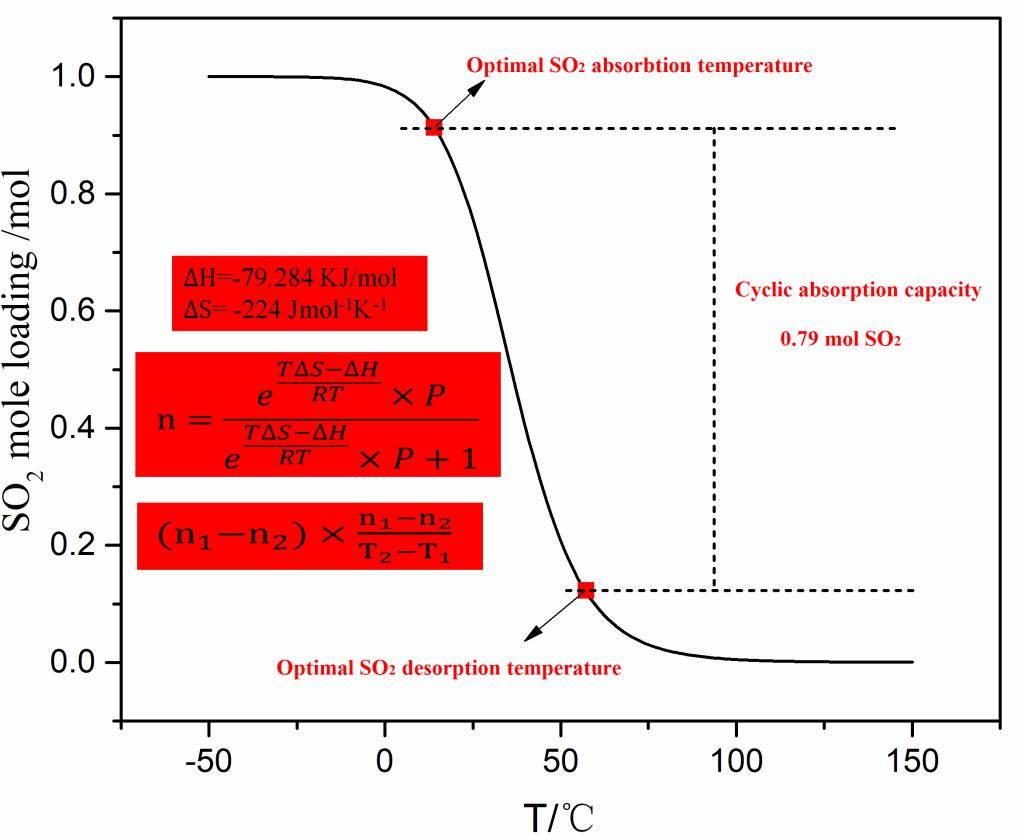 另外课题组通过两步反应合成了一种低粘度、高热稳定性的二丁基-(1,1-二甲基-3,3,3-三苯基-二硅氧烷基甲基)-胺(DDTDA)。发现其与SO2的反应焓和熵变分别为-85.39 KJ/mol和-244 J mol-1K-1,其绝对值相比于DPSA得到进一步增加。数学实验证明,简单地比较两种吸收剂在一定温度下的容量来评估它们的吸收性能是不科学的。不同的吸收剂具有不同的最佳捕集温度范围,该范围由其反应焓变和熵变决定。相关研究成果以“A standard function to evaluate optimal absorption and desorption temperature of SO2absorbent: Taking amine alkyl organosilicon as example”为题发表在化工领域国际Top学术期刊Separation and Purification Technology上(论文链接://doi.org/10.1016/j.seppur.2022.120634)。论文第一作者为捕鱼游戏赚钱2020级硕士研究生童向鑫,通讯作者为赵文波教授,通讯单位为捕鱼游戏赚钱平台