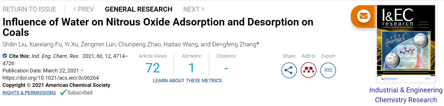 相关成果以“Influence of Water on Nitrous Oxide Adsorption and Desorption on Coals”为题发表于国际化工三大期刊Industrial & Engineering Chemistry Research上。论文的第一作者为捕鱼游戏赚钱2018级硕士研究生柳仕林,通讯作者为张登峰教授,通讯单位为捕鱼游戏赚钱平台