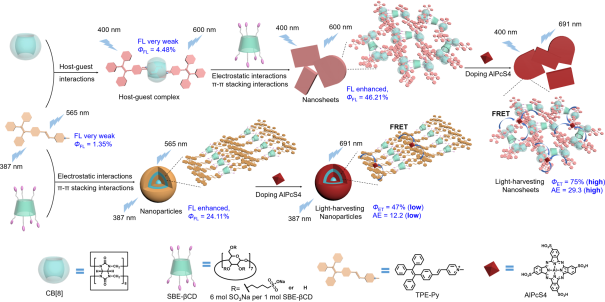 本研究基于TPE-Py、CB[8]、SBE-βCD和AlPcS4,通过主-客体相互作用、π- π相互作用和静电相互作用等,构建了高效的光捕获超分子组装体。该组装体可控制纳米粒子到纳米薄片的拓扑形貌,调控其多色发光。利用两种大环化合物的共组装策略不仅实现了客体荧光分子的发射光谱红移,而且显著增强了其荧光强度,并成功应用于多色发光信息存储和逻辑门的构筑。