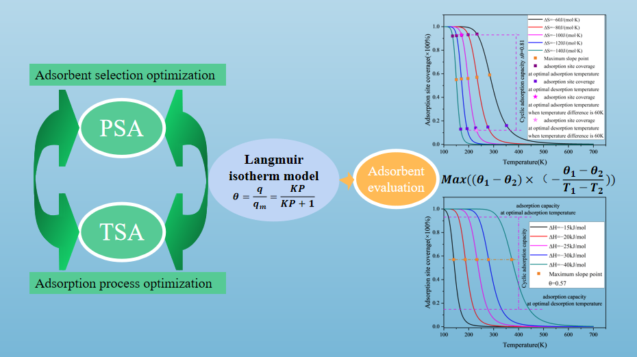 传统方法主要在特定温度下比较吸附剂的性能,精确衡量不同种类吸附剂的最佳吸附条件通常需要进行大量的试验探索。分子分离与催化团队通过研究现有文献中的吸附数据,发现引入Langmuir模型结合吸附等温线,能够准确获取变压吸附(PSA)和变温吸附(TSA)工艺过程中的最佳吸附条件及热力学参数(熵变和焓变)值。通过建立函数模型,能够有效量化不同吸附剂的最佳吸附工艺条件。这一函数模型不仅为寻找高效吸附过程的最优条件提供了新方法,同时也为评估不同材料的吸附性能建立了可行的方案。