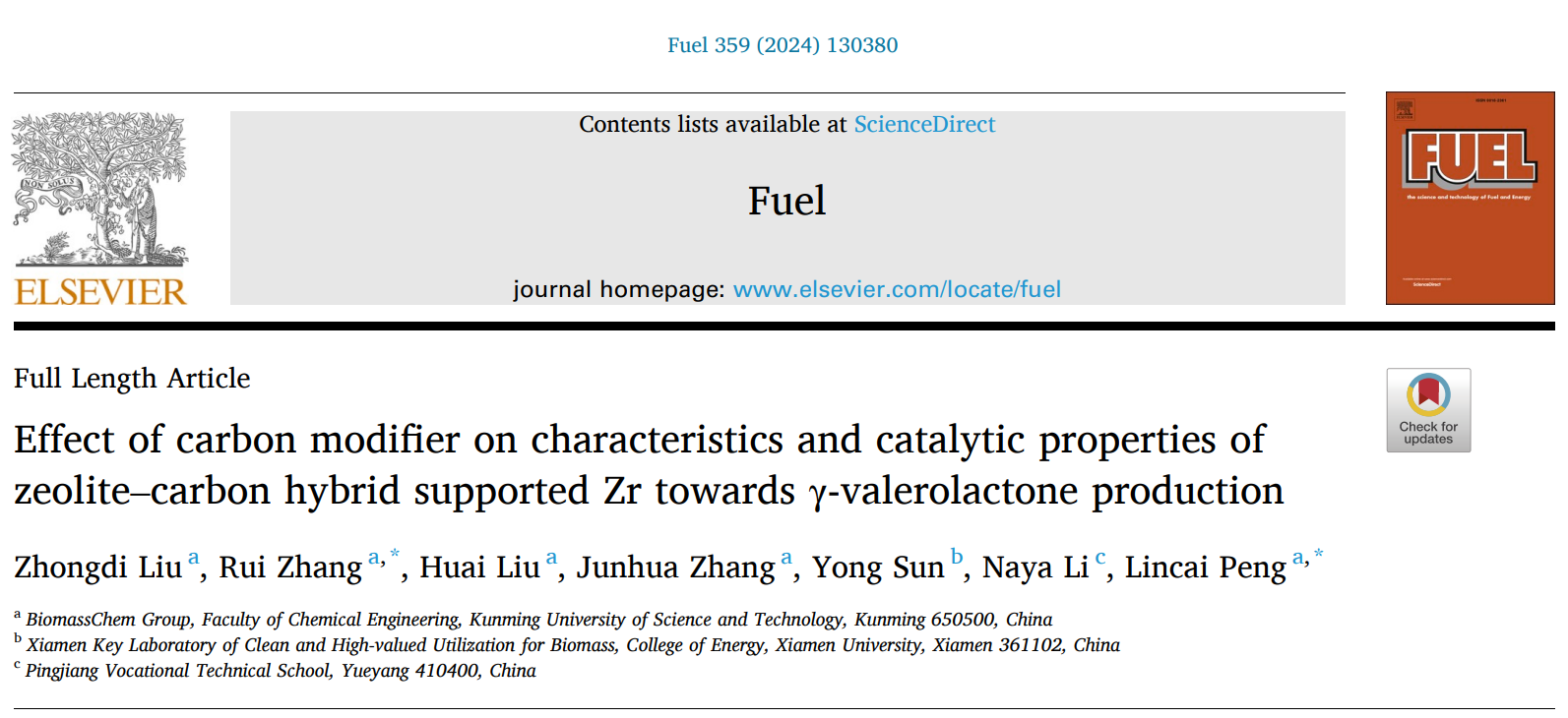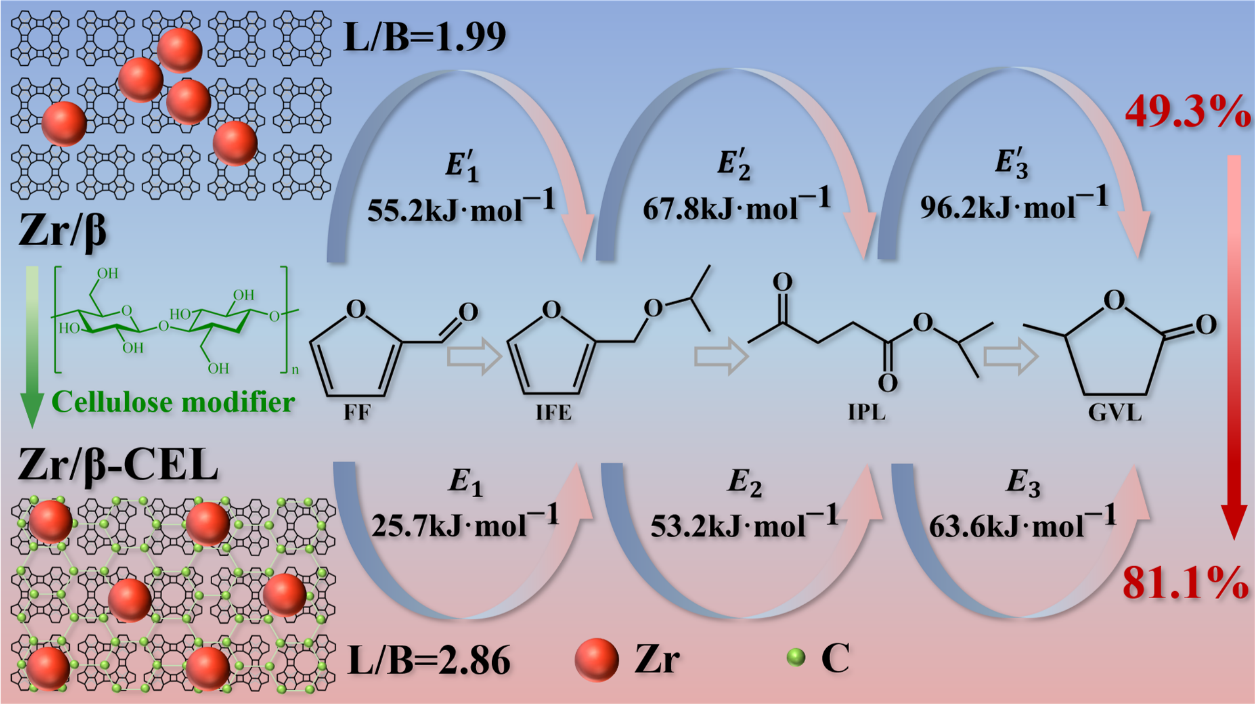 研究进展四:γ-戊内酯是一种先进的新能源化学品,具有广泛的工业应用价值,可作为燃料添加剂、润滑剂、增塑剂、有机溶剂、以及生产烯烃和聚合物的前驱体。团队以糠醛为反应原料,采用纤维素碳作为Zr/β分子筛的改性剂,制备成多功能高性能催化剂,利用“一锅法”策略在无外源氢气条件下实现了糠醛直接到γ-戊内酯的绿色高效转化,产物收率从49%提升到81%。研究表明:使用纤维素作为碳改性剂有利保持β分子筛的结构完整性、增大催化剂介孔体积和孔径,从而提高活性位点可及性和利于反应物/产物扩散。研究成果可为糠醛提质制备γ-戊内酯提供理论与技术指导。