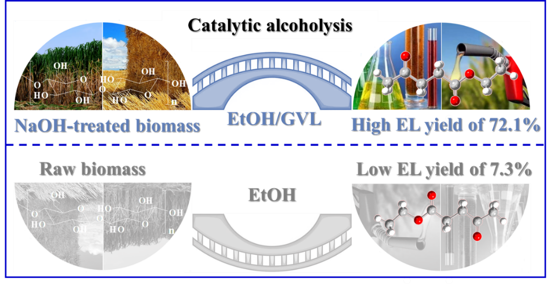 研究进展二:针对木质纤维生物质原料组分多样和结构复杂,催化制备乙酰丙酸酯产物收率低等问题,团队开发了一种通过预处理生物质原料结合绿色共溶剂介导催化反应的串联体系,可使巨菌草杆中纤维素高效催化转化成乙酰丙酸酯,产物收率高达72%。通过反应过程及动力学研究揭示了水洗预处理和γ-戊内酯共溶剂在促进生物质原料中纤维素催化转化的作用机理。该成果为从生物质原料制备酯类化合物提供了一种绿色、简单且高效的方法。
