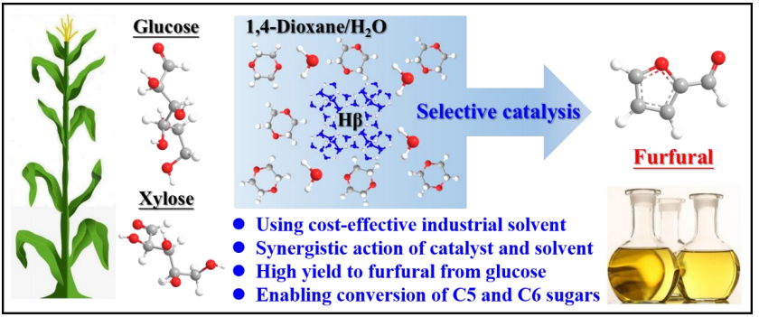 研究进展一:目前糠醛工业生产仅可利用生物质原料中的五碳糖,剩余的大量纤维素及其衍生的六碳糖未被有效利用。团队开发了一种利用工业级Hβ沸石在1,4-二氧六环/水混合溶剂体系中同时转化五碳糖和六碳糖为糠醛的新策略,产物收率可达63%。研究揭示了1,4-二氧六环和水在六碳糖转化为糠醛中的重要作用,它们协同催化剂促使葡萄糖C-C键发生定向断裂,实现产物选择性合成。该成果可为生物质组分有效利用制备糠醛提供理论支撑与方法借鉴。