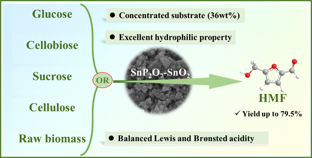 研究进展三:针对催化生物质原料制备5-羟甲基糠醛底物浓度低的问题,团队开发了一种具有SnP2O7和SnO2混合结构的锡基催化剂,该催化剂在催化转化高浓碳水化合物以及生物质原料(36~72wt%)制备5-羟甲基糠醛方面展现出优异的催化反应活性,产物收率可达45~79%。研究发现该催化剂具备恰当的酸性强度、酸性位点种类和超亲水性,它们的协同作用有助于高底物浓度生物质原料的催化转化,可为5-羟甲基糠醛的高效制备提供理论与技术参考。
