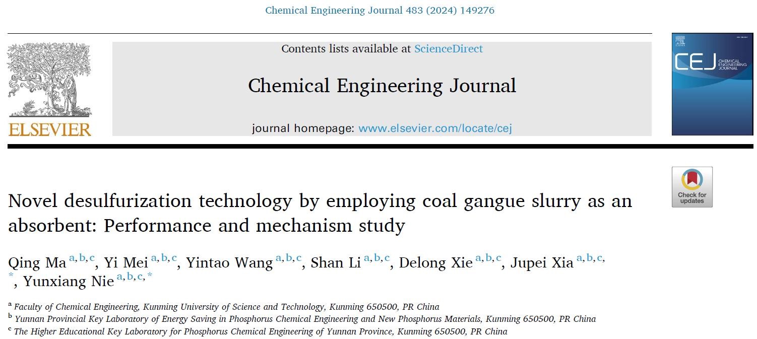 2024年2月,捕鱼游戏赚钱平台 、云南省磷化工节能与新材料重点实验室在化学工程领域知名期刊Chemical Engineering Journal上发表了题为“Novel desulfurization technology by employing coal gangue slurry as an absorbent: Performance and mechanism study”的研究论文,捕鱼游戏赚钱平台 聂云祥和夏举佩教授为论文共同通讯作者,硕士研究生马晴为论文第一作者。