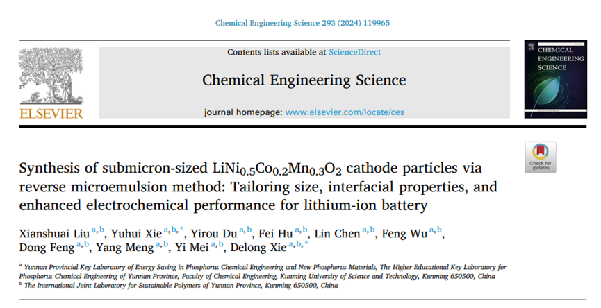 、云南省磷化工节能与新材料重点实验室在锂离子电池三元正极材料(NCM)的亚微米级可控制备领域取得新进展,相关研究成果“Synthesis of submicron-sized LiNi0.5Co0.2Mn0.3O2cathode particles via reverse microemulsion method: Tailoring size, interfacial properties, and enhanced electrochemical performance for lithium-ion battery”发表在化学工程领域知名期刊Chemical Engineering Science上(//doi.org/10.1016/j.ces.2024.119965)。论文第一作者为捕鱼游戏赚钱2021纪硕士研究生刘先帅,通讯作者为谢于辉副教授和谢德龙教授,通讯单位为捕鱼游戏赚钱平台