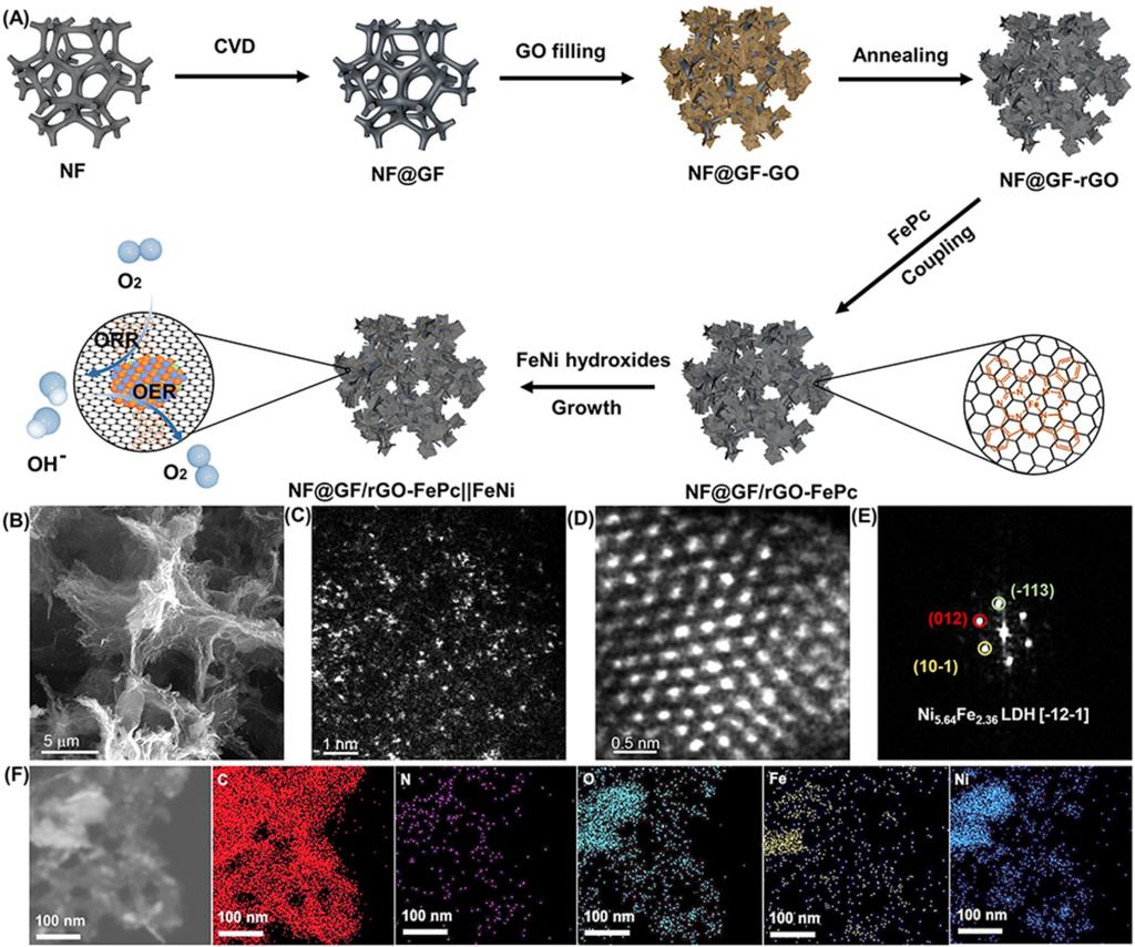 基于此,本工作提出自支撑三维互连石墨烯网络锚定Fe-N4团簇和FeNi氢氧化物作为空气电极的策略,通过在泡沫镍上催化生长石墨烯并将还原氧化石墨烯填充到泡沫孔隙中,形成了一个传质速率快且高导电性的三维互连石墨烯网络,随后利用该网络锚定含有Fe-N4位点(铁酞菁)和FeNi氢氧化物,分别用于促进放电过程中的ORR和充电过程中的OER,实现高性能多功能空气电极的构建。实验研究结合理论研究证明了研制的空气电极在水系和柔性固态ZABs应用上具有良好的实用性,并揭示其高电催化活性的内在原因。