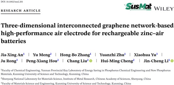 上述研究以“Three-Dimensional Interconnected Graphene Network-Based High-Performance Air Electrode for Rechargeable Zinc-Air Batteries”为题,发表在SusMat(IF=28.4)上。论文的第一作者为捕鱼游戏赚钱2021级硕士研究生安佳兴,通讯作者为捕鱼游戏赚钱李金成副教授、昆明理工大学材料学院荣菊副教授及中国科学院金属研究所刘畅研究员。该研究工作得到了国家自然科学基金(52102046)及云南省优秀青年基金项目(202301AW070016)的资助。