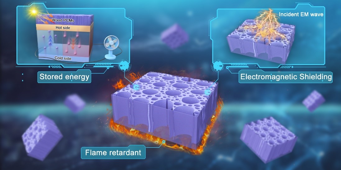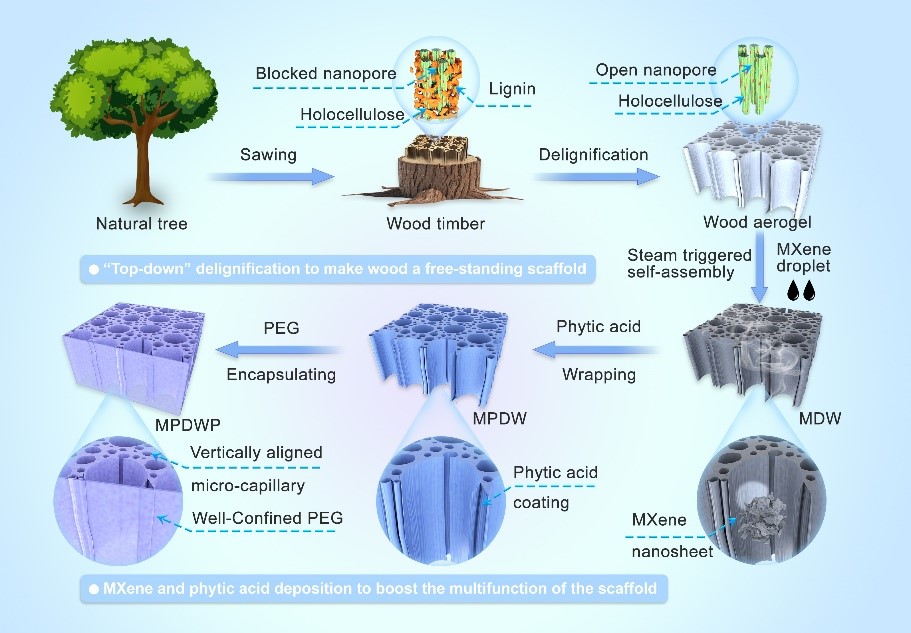 磷化工团队提出了一种新的设计理念。通过一种简便环保的合成方法,借助木材遗态材料固有的各向异性和单向多孔性来支撑聚乙二醇(PEG),开发出一种新型复合相变材料(CPCMs)。木材改性过程涉及通过蒸发诱导自组装方法将含磷植酸(PA)和二维MXene纳米片杂化结构引入其中。