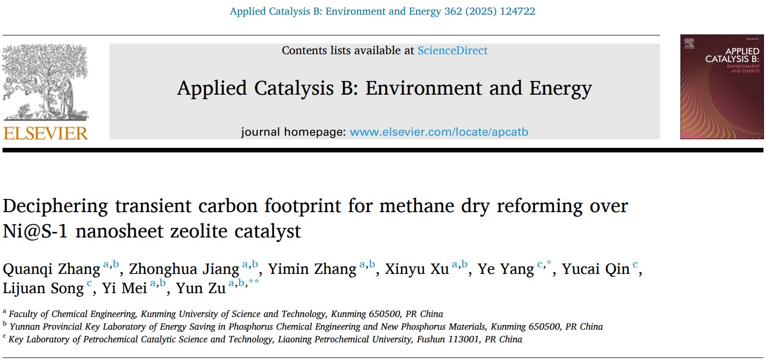 近日,捕鱼游戏赚钱 磷化工团队祖运副教授、梅毅教授联合辽宁省石油化工催化科学与技术重点实验室宋丽娟教授团队围绕破译甲烷干重整在镍基纳米片分子筛催化剂上瞬态碳足迹的最新研究成果“Deciphering Transient Carbon Footprint for Methane Dry Reforming over Ni@S-1 Nanosheet Zeolite Catalyst”在环境和能源催化领域著名学术期刊Applied Catalysis B: Environment and Energy(IF=20.2)发表。捕鱼游戏赚钱平台 为论文第一通讯单位,2022级硕士研究生张全淇为论文第一作者,祖运副教授为论文通讯作者。