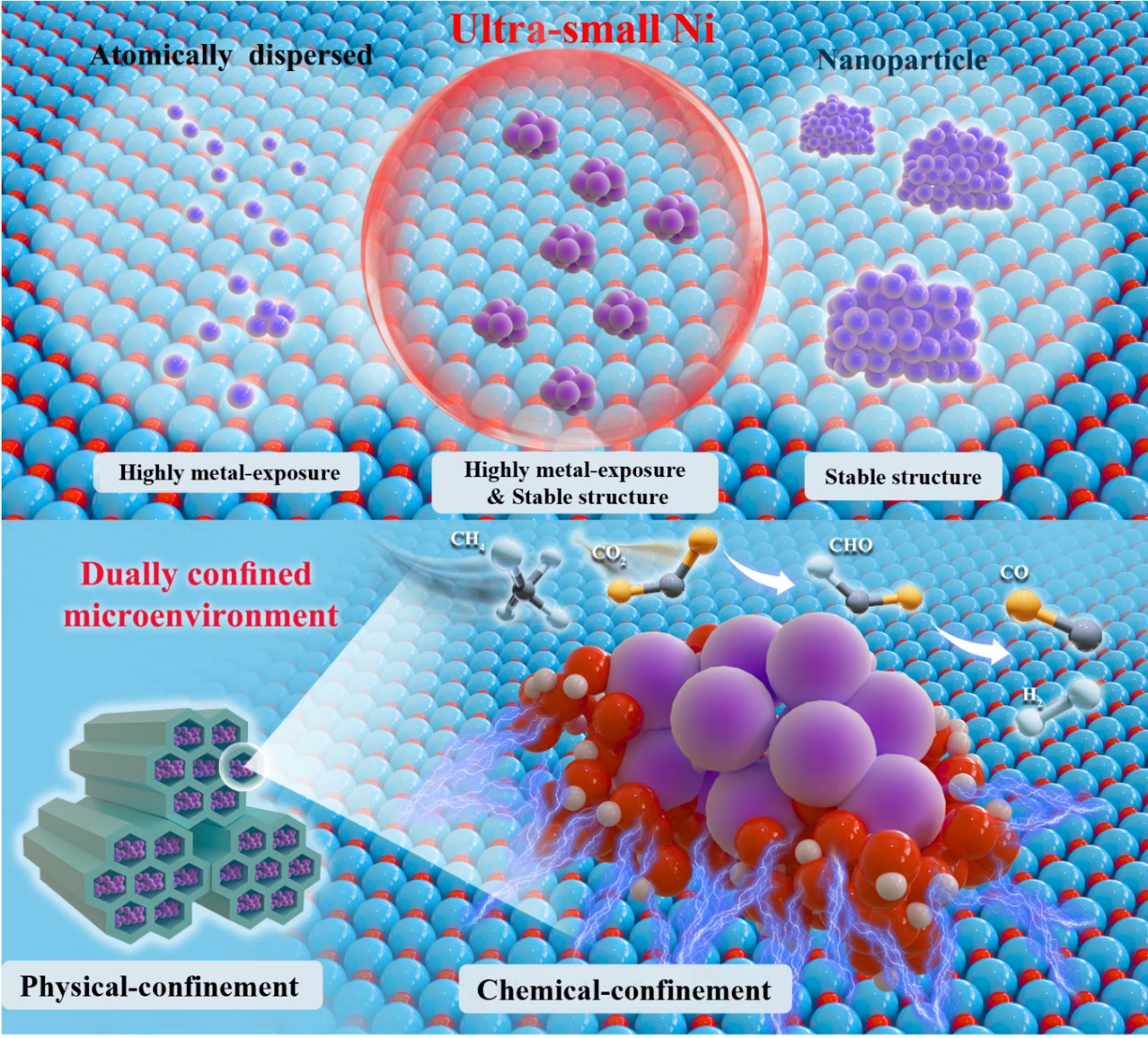 甲烷(CH₄)和二氧化碳(CO₂)的催化重整反应是实现温室气体资源化转化和生产高附加值化学品的有效途径。镍(Ni)基催化剂因其高活性和相对较低的成本,在甲烷重整等多相催化反应中备受关注。然而,高温多相催化反应研究中存在催化剂的尺寸与热稳定性难以匹配问题。因此,如何设计一种兼具高温稳定性和高金属暴露活性的镍基催化剂是研究难点。基于此,罗永明教授团队通过硅基载体表面羟基修饰及其强化静电吸附过程,解决传统硅基载体难以有效锚定金属位点的难题。结合硅基载体孔道限域效应,成功制备了具有高金属暴露度和高温热稳定性的超小Ni纳米颗粒,双重限域微环境打破了高温多相催化剂设计的稳定-暴露平衡问题,也为其他高温催化反应中高性能、抗烧结催化剂的设计提供了新的思路。