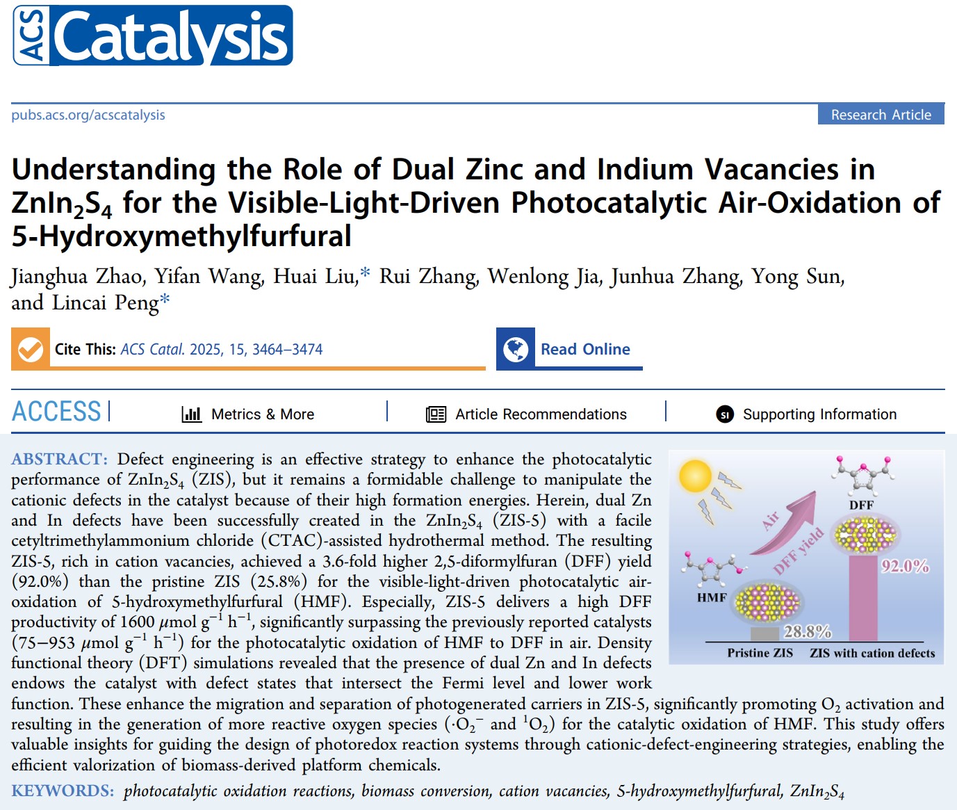 生物质化工团队在光催化氧化提质生物质平台分子方面取得创新突破,相关研究成果以“Understanding the Role of Dual Zinc and Indium Vacancies in ZnIn2S4for the Visible-Light-Driven Photocatalytic Air-Oxidation of 5‑Hydroxymethylfurfural”为题发表在催化领域国际权威TOP学术期刊《ACS Catalysis》上。捕鱼游戏赚钱平台