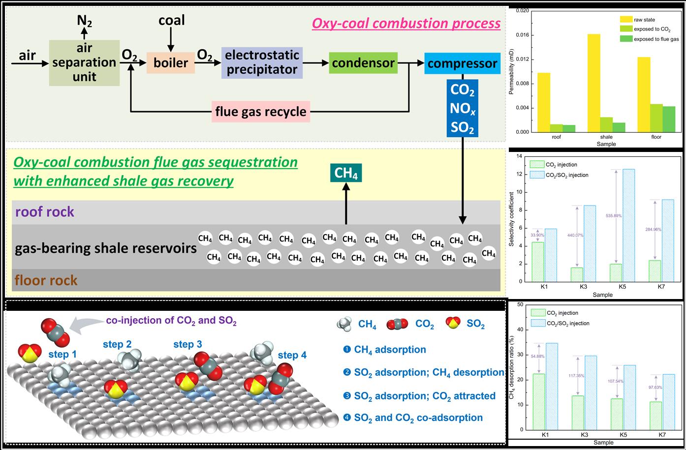 非常规油气勘探/开发与二氧化碳地质封存团队测定了页岩对单组分CO2和SO2的吸附/解吸性能、采用二元组分CO2/SO2模拟富氧燃煤烟气以驱替CH4、开展了CO2/SO2/NO-H2O-页岩/围岩作用以明确目标储层对富氧燃煤烟气的封存稳定性。研究结果表明:(1)页岩对SO2的吸附性能优于CO2,对二者的解吸性能则反之,表明SO2于储层中的封存稳定性及其对CH4的驱替效果有望优于CO2;(2)相较于现行CO2-ESGR技术,CO2/SO2驱替模式能够显著提升页岩的CH4解吸能力和CO2封存潜力;(3)模拟原位储层条件下,富氧燃煤烟气能够引发矿化效应实现储层流体的稳定封存,并增强围岩封堵性能。