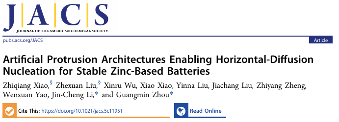 李金成副教授与清华大学深圳国际研究生院周光敏副教授合作,在高性能锌基水系电池研究方面取得重要进展,相关研究成果以“Artificial Protrusion Architectures Enabling Horizontal-Diffusion Nucleation for Stable Zinc-Based Batteries”为题发表在化学顶级期刊Journal of the American Chemical Society上。