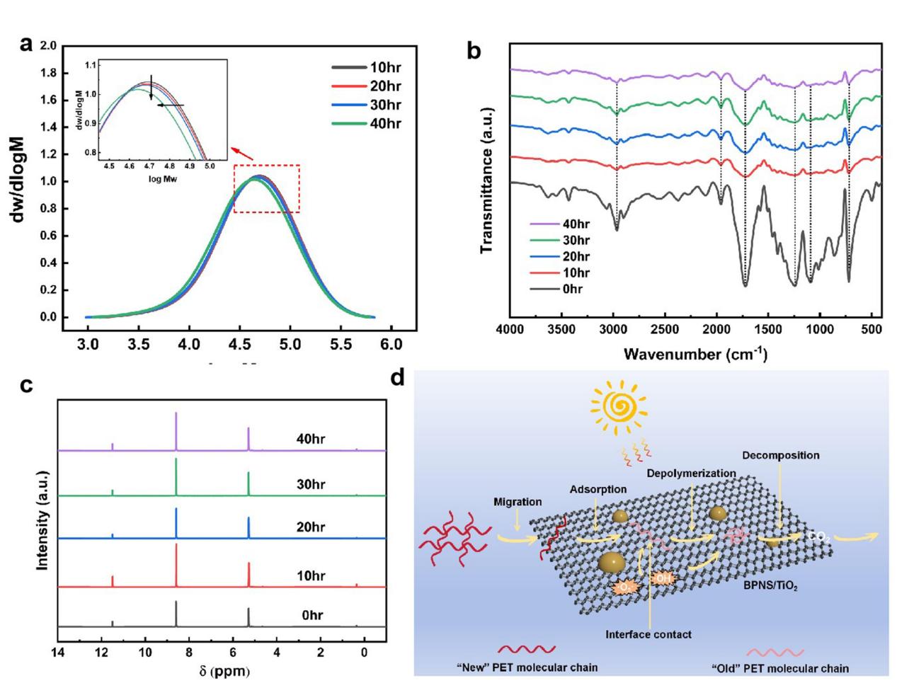 在本研究中,团队首次构建了黑磷纳米片/二氧化钛(BPNS/TiO2)异质结光催化剂,利用黑磷可调控带隙与高载流子迁移率的优势,实现了对聚对苯二甲酸乙二醇酯(PET)等典型塑料的高效光重整。在模拟太阳光照射下,该催化剂实现了高达80%的PET降解率,并伴随高效产氢(345.2 μmol g-1 h-1),展现出绿色、低能耗的塑料回收与能源转化潜力。值得一提的是,通过黑磷烯的带隙调控,研究首次建立了光催化剂导带电位(ECB)与产物选择性(CO、H2、CO2)的关系,为塑料废弃物光转化催化剂的理性设计提供了新路径。同时,研究揭示了常见添加剂对降解效率的影响:光稳定剂会显著降低降解率,而增塑剂则通过提升分子链运动性促进降解。进一步研究表明,该催化体系对聚乙烯(PE)、聚苯乙烯(PS)及聚氯乙烯(PVC)等塑料同样具有催化降解与产物调控能力,应用前景广阔。