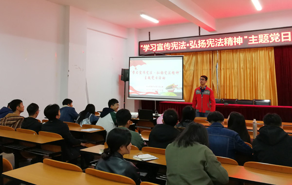 2018年12月17日下午17:00,化工学院学生第三党支部在化工楼负一楼报告厅开展“学习宣传宪法·弘扬宪法精神”活动,活动由支部书记袁敬老师主持,全体党员参加。