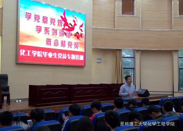 2017年5月17日晚,化工学院在报告厅对80名党员举行了专题培训,主讲为装控专业学生党支部袁敬老师。