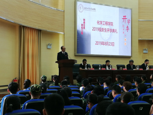 2019级新生开学典礼在化工100报告厅举行。此次典礼有学院党委书记齐毅老师、学院党委副书记李云燕老师、院长梅毅教授、学院副院长李斌教授、副院长贾庆明教授、装控系主任宋鹏云教授、化工系主任夏举佩教授、生物质资源系主任彭林才教授以及学院全体辅导员老师、2019级班主任老师出席,2019级全体新生参加,并由李云燕老师主持。