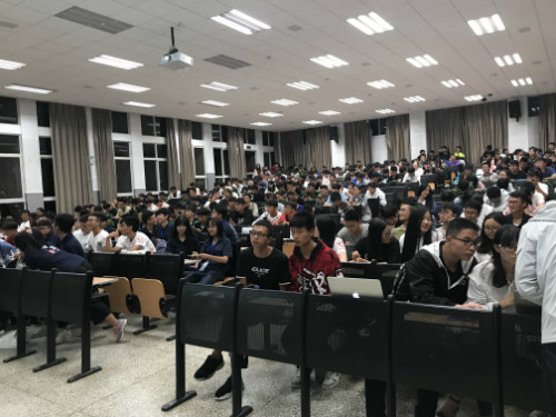 宣讲会期间18级新生还与主持人、宣讲人积极互动,主持人就之前宣讲的内容向18级新生提问,并给答对的同学送出由团委、学生会准备的电影票优惠券。