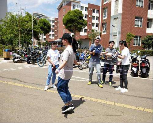 活动开始,参加活动的全体人员在公教楼集合进行分组,分组完毕后趣味奔跑活动正式开始。本次活动奔跑路线贯穿昆明理工大学呈贡校区,活动地点共分为七站,分别为公教楼站、恬园站、憬园站、怡园站、建工楼站、明理楼站和昆工一号门站,每个站点均有不同的游戏,各队伍完成该站游戏,方可出发去下一站。活动游戏包括:指压板运球、接力跳绳500、合力踢毽子60、合力吹气球、蒙眼探秘一号门,全部通关后的队伍在公教楼草坪进行3v3撕名牌比赛,绿色的草坪上,同学们本着“友谊第一、比赛第二”的原则,团结协作、认真努力地争取胜利,不时还传来欢声笑语。