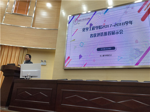 2017-2018学年省优评选推荐展示会于2018年3月29日下午16:00在化工楼100报告厅举行。院党委副书记李云燕老师、学工办主任袁敬老师、学工办李凯宇老师、化工院学生代表共计100余人参加了本次大会。