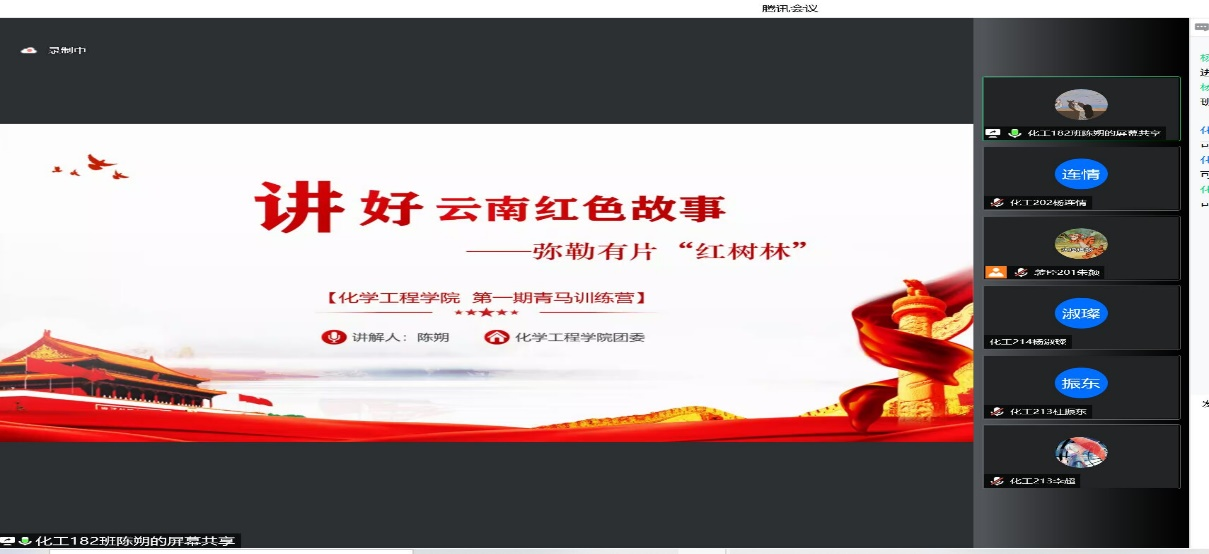 团委在腾讯会议上开展第十一期“青年马克思主义者培养工程”青卓班第五次主题活动。全体青卓班成员及团委学生会全体成员、各班团支书参加了此次活动。此次活动由组织部张连浩同学主持,昆明理工大学2021年度先进基层团支部化工182班团支书陈朔同学担任此次主讲嘉宾。