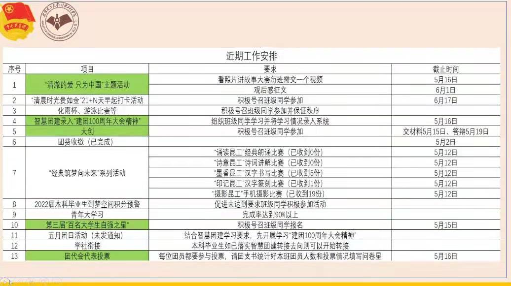 首先由朱芝老师强调了“青年大学习”的重要性,她强调团中央在全团部署实施“ 青年大学习”行动, 突出理论武装和思想引导, 通过构建“ 导学、讲学、研学、比学、践学、督学“六位一体的学习体系, 着力提升学习的制度化和实效性, 推动党的创新理论深入人心, 引导广大青年坚定不移听党话、跟党走。作为新时代的团员青年更应该主动学习,积极作为,各团支书做好监督引导工作,完成既定学习目标。接下来部分团支书做了工作交流。随后,李凯宇老师强调了近期的重点工作,如团学代会的代表选举、“经典筑梦向未来”的作品申报,“清澈的爱只为中国”的主题活动,毕业班第二课堂积分帮扶,学社衔接相关工作等。