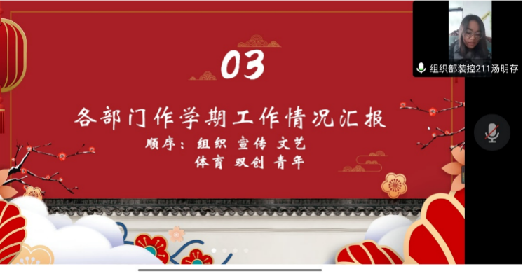 议程第一项,参会人员依次进行自我介绍。议程第二项,化工院团委、学生会各部门依次作学期工作总结汇报,由各部门负责人针对2022-2023学年第一学期部门工作的完成情况、遇到的困难以及工作经验反思总结等方面进行了阐述。议程第三项,李凯宇老师作总结发言。李老师的发言表达了对学院团委、学生会过去取得成绩的认可,同时对接下来的团委工作提出了合理建议与规划。
