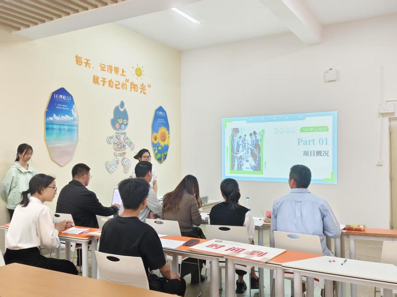 结题验收现场,张蕊、赵海利等 5 位评委对“MOFs 水凝胶复合材料吸附抗生素”等16个项目进行终期考核。各团队通过 7 分钟成果展示,重点呈现研究突破、专利申请、产业化前景等内容。评委聚焦成果完整性与实践价值,建议同学们进一步深化产学研结合。