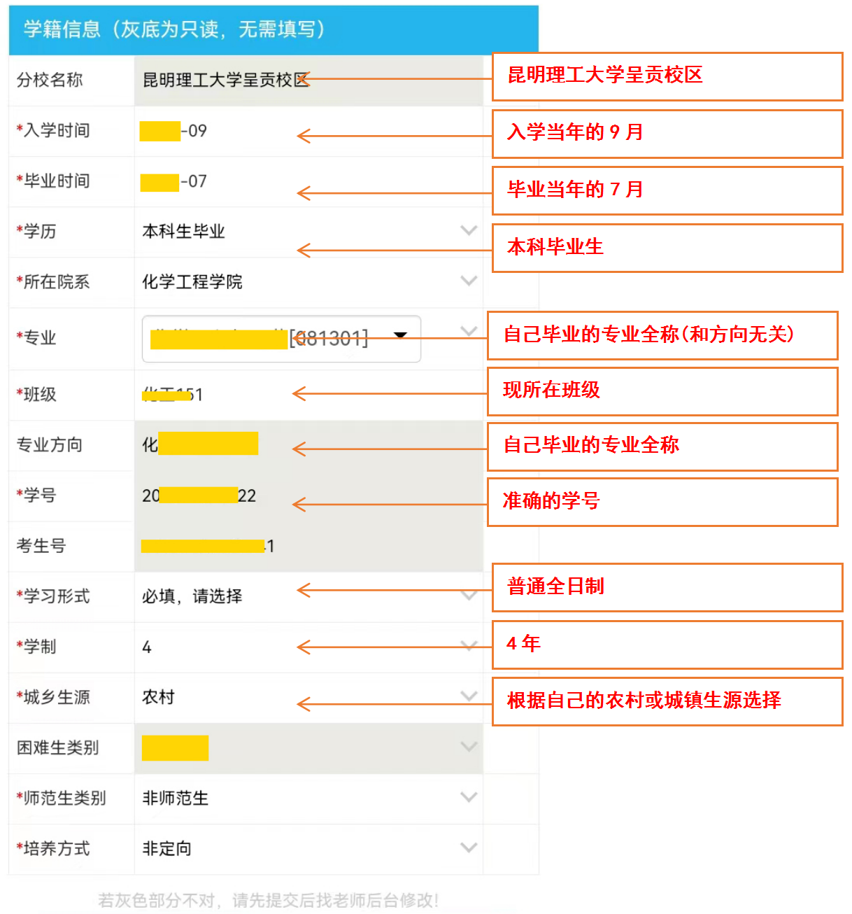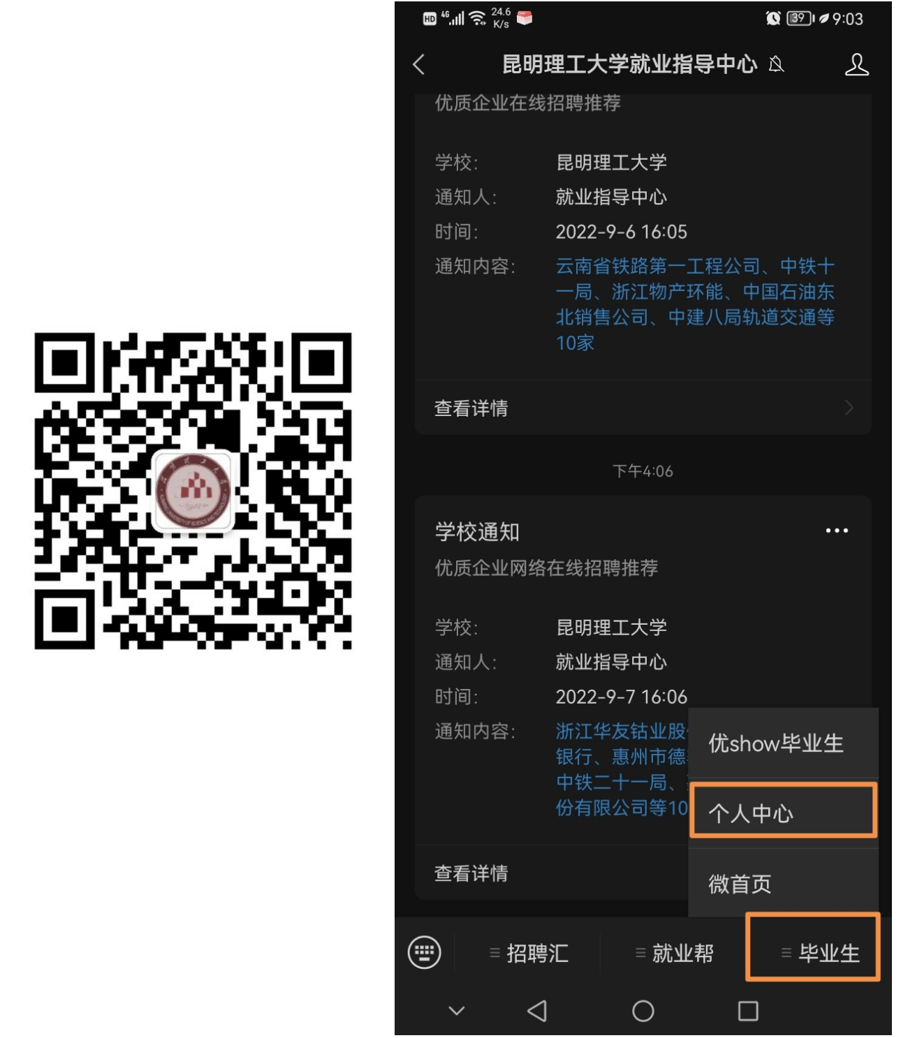 毕业生可登陆昆明理工大学就业网//job.byzq.org/,或微信识别二维码,关注“昆明理工大学就业指导中心”微信号,通过“微信公众号——毕业生——个人中心——生源信息”核对信息,注意事项如下: