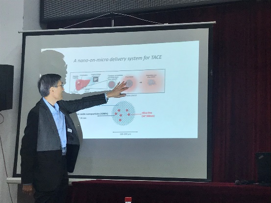 报告中,温云基Wankei Wan教授介绍了经动脉化学栓塞疗法(TACE)治疗肝癌的理念,药物缓释系统的必要性,以及药物洗脱微球的应用和提高其疗效的相关研究。同时探讨了如何运用“纳-微米”系统实现栓塞、追踪、定向、给药和分解等多功能。Wan教授深入浅出地讲解了将具有良好性能的纳米粒子掺入微珠基质中制备多功能微珠的方法。使老师和同学了解到了相关学科的前沿动态,对师生科研工作的开展具有很好的启示作用。报告会后,Wan教授与学院老师就相关教学和研究领域进行了深入交流和探讨。