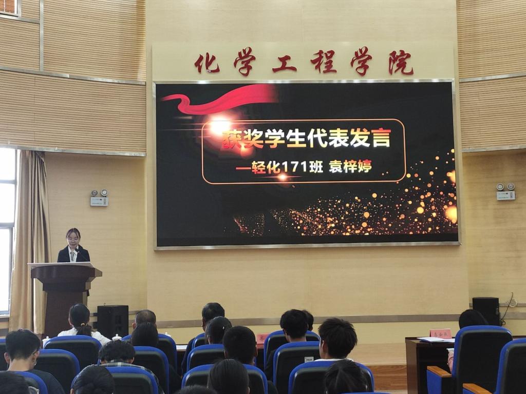 轻化171班袁梓婷作为获奖学生代表发言, 表达了对云南云景林纸股份有限公司衷心的感谢,表示将珍惜大学时光,坚定理想信念,矢志学习,奋斗新征程,交出合格的答卷。