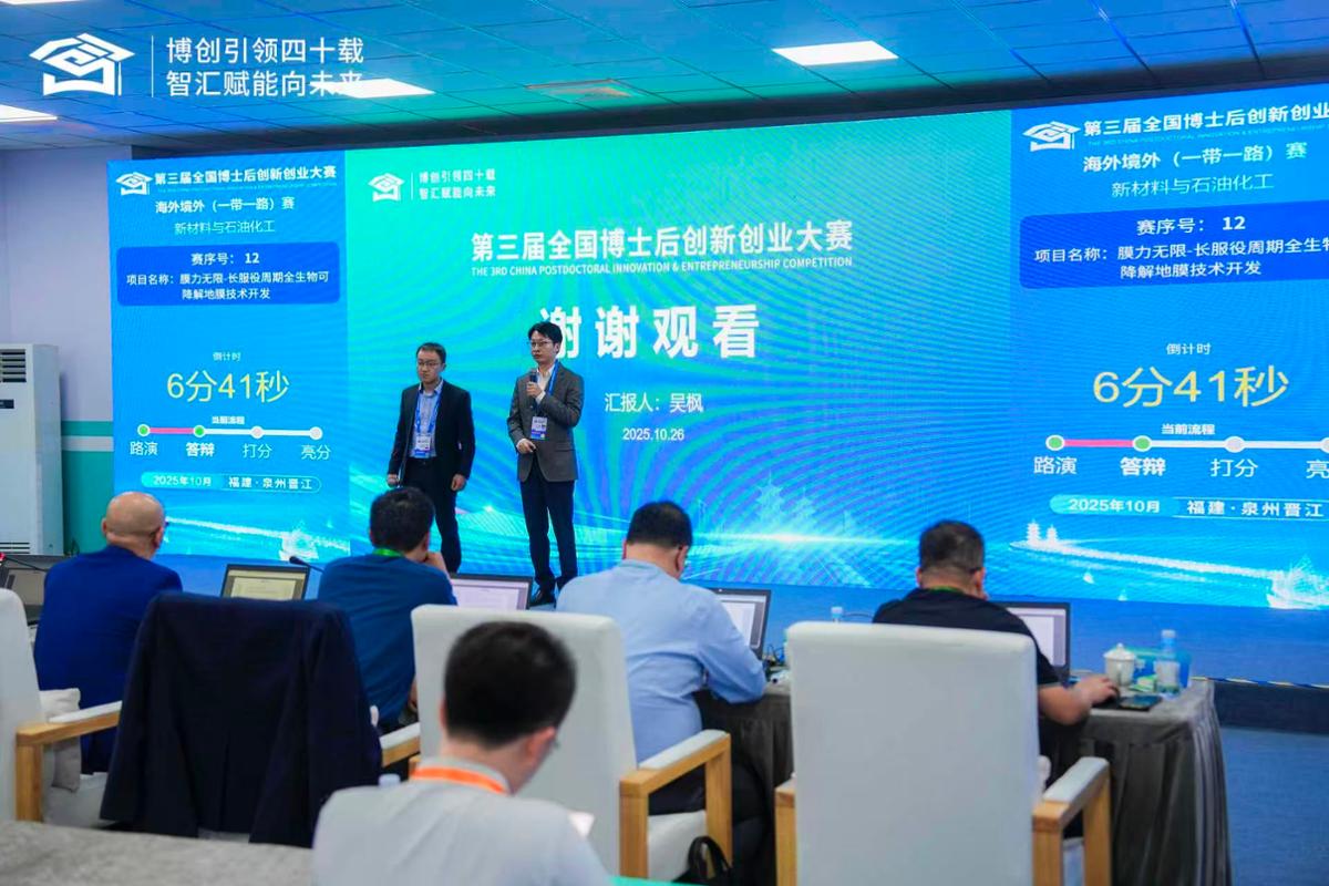 2025年10月28日,第三届全国博士后创新创业大赛总决赛在福建省泉州市圆满落幕。磷化工重点实验室团队教师吴枫、谢于辉、冯东凭借项目《膜力无限——长服役周期全生物可降解地膜技术开发》荣获铜奖。这是继第二届全国博士后创新创业大赛中,谢德龙教授以《防火于未燃的新一代水性聚氨酯阻燃涂料》项目摘得金奖之后,重点实验室成员再次在该赛事中取得优异成绩。