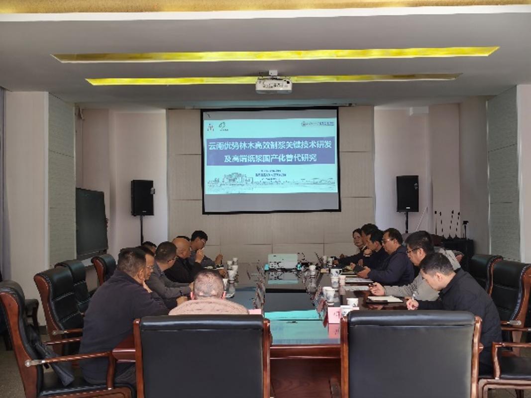 罗永明院长对云南云景林纸股份有限公司和云南红塔蓝鹰纸业有限公司领导一行表示热烈欢迎,并介绍了学院在学科建设、科学研究、人才培养等方面的发展情况与近年取得的主要成效。生物质工程系主任张俊华教授作了题为“云南优势林木高效制浆关键技术研发及高端纸浆国产化替代研究”的项目报告。与会三方围绕西南特色植物纤维高值化发展的合作路径进行了深入研讨,一致认为:结合云南区域植物资源禀赋与产业优势,开展从原料到工艺的浆纸全链条技术攻关研发,形成具有自主知识产权的核心技术体系,对保障相关产业供应链安全、提升我国浆纸产业的核心竞争力具有重要意义。
