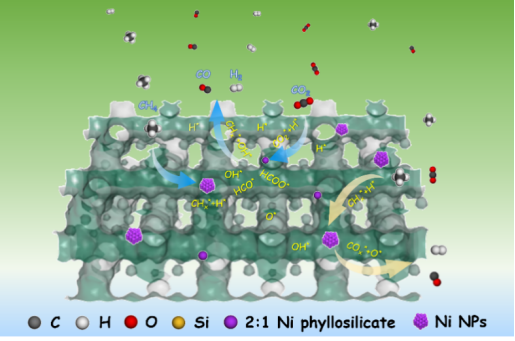 近些年,甲烷(CH4)和二氧化碳(CO2)作为温室气体,其大量排放造成了全球变暖和气候变化。甲烷干重整(DRM,CH4+CO2→2H2+2CO,∆H0 298K=+247kJ/mol)作为一种实现两者高效资源化利用的理想技术路线之一,为将其转化为有价值的合成气提供了有效途径,通过调节H2/CO比,可进一步转化为各类高附加值化学品(如甲醇、低碳烯烃等)。与贵金属作为活性组分相比,镍(Ni)基催化剂具有活性高、资源丰富、成本低等优点,被认为在DRM反应中具有大规模工业应用的可行性。然而,当前面临的主要问题是:高温下活性组分Ni热敏感性高,极易迁移、团聚甚至烧结,使其难于保持高度分散,造成Ni活性相催化效率快速下降,积碳量急剧增加,甚至Ni活性相因烧结永久失活。