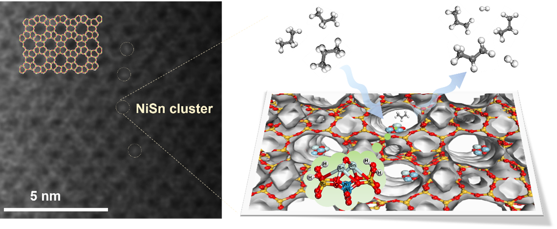 磷化工团队以湿法磷酸生产的氟硅酸为原料,采用沉淀法制备了廉价硅源,通过一步水热合成法成功合成了高分散和高稳定的NiSn亚纳米团簇并使其封装于Silicalite-1分子筛的孔道内。所合成的Ni1Sn1@S-1分子筛催化剂(Ni/Sn = 1:1)具有优异的PDH催化活性、高丙烯选择性和再生稳定性。最重要的是,经3次再生循环后,没有发现Sn流失。作为对比,还制备了Ni@S-1和Sn@S-1分子筛,其催化性能或稳定性远低于Ni1Sn1@S-1催化剂。通过HRTEM、H2-TPR、FTIR和XPS等表征手段对催化剂上的NiSn位点进行了结构表征,证实了嵌入在分子筛骨架孪对硅羟基中的Ni位点在锚定Sn物种和防止活性位点的丢失和烧结中起着至关重要的作用。由此可见,稳定的NiSn亚纳米团簇的协同作用有利于C-H选择性活化和丙烯脱附。与此同时,我们进一步采用原位红外光谱技术揭示了一种合理的丙烷脱氢机理。