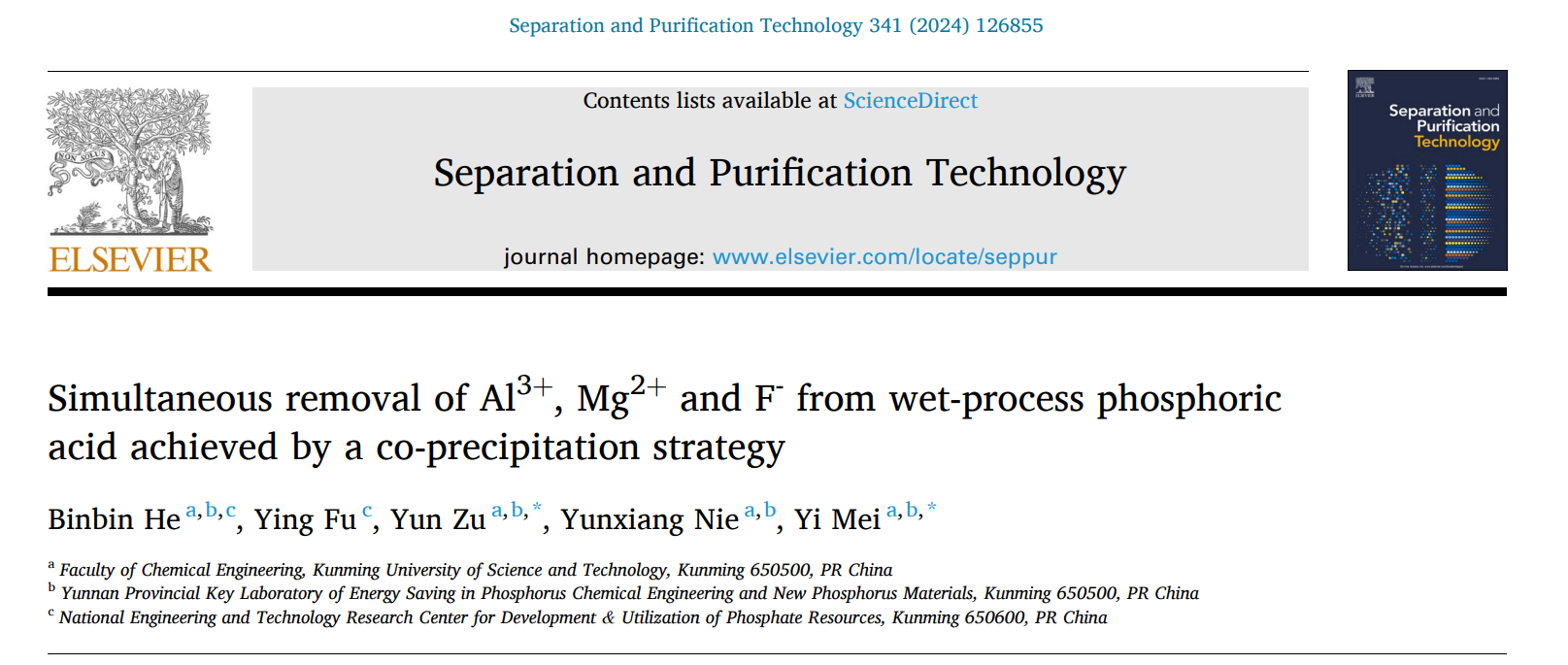 上述研究成果以《Simultaneous removal of Al3+, Mg2+and F-from wet-process phosphoric acid achieved by a co-precipitation strategy》为题发表在化工领域TOP学术期刊《Separation and Purification Technology》上。捕鱼游戏赚钱平台