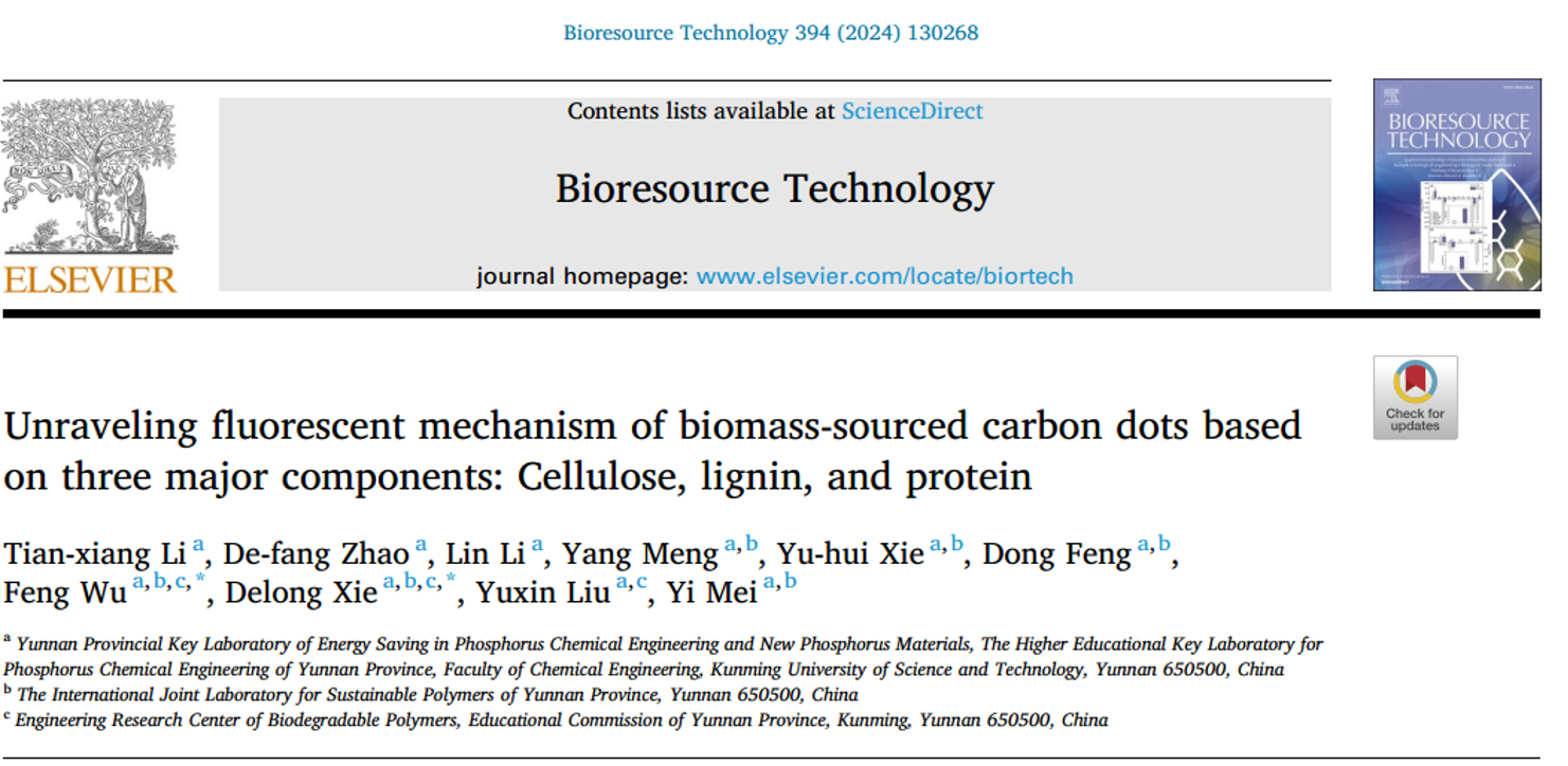 上述研究成果以“Unraveling fluorescent mechanism of biomass-sourced carbon dots based on three major components: Cellulose, lignin, and protein”为题发表在知名期刊Bioresource Technology上。论文第一作者为磷化工团队2021级硕士研究生李天祥,通讯作者为谢德龙教授和吴枫讲师,捕鱼游戏赚钱平台